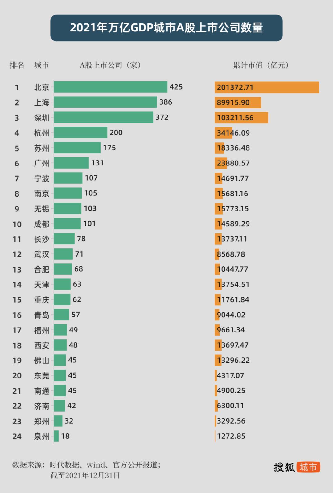 过去一年,万亿俱乐部有5座城市新增A股上市公司数量超过30家,分别为上海(50家)、北京(48家)、深圳(42家)、杭州(38家)和苏州(35家)。这5座城市的增量,就占了全国的40%以上。