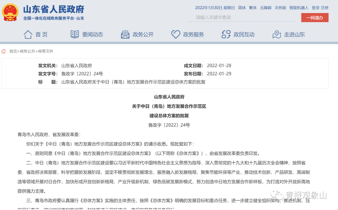 山东省政府app1月30日发文:省政府原则同意《中日(青岛)地方发展合作示范区建设总体方案》(以下简称《总体方案》),将由省发展改革委负责印发。
