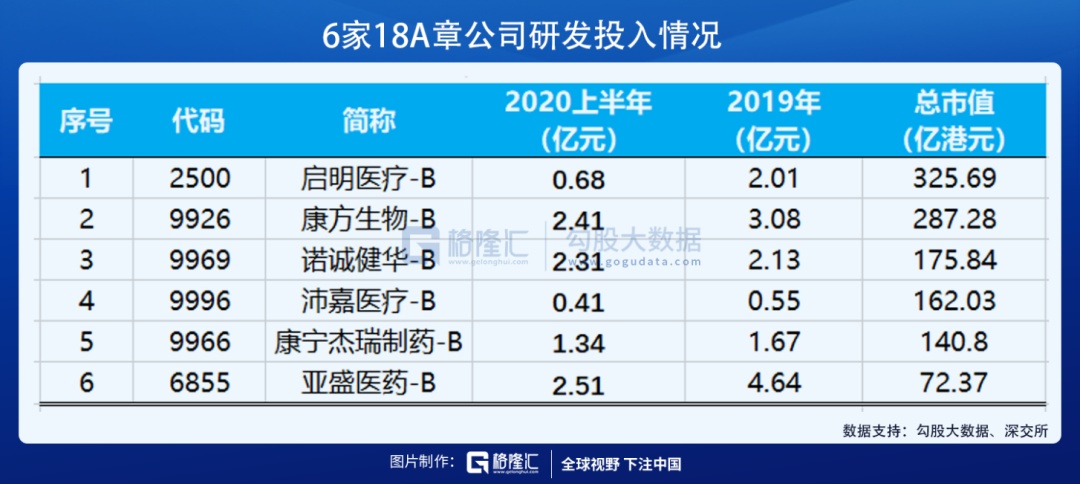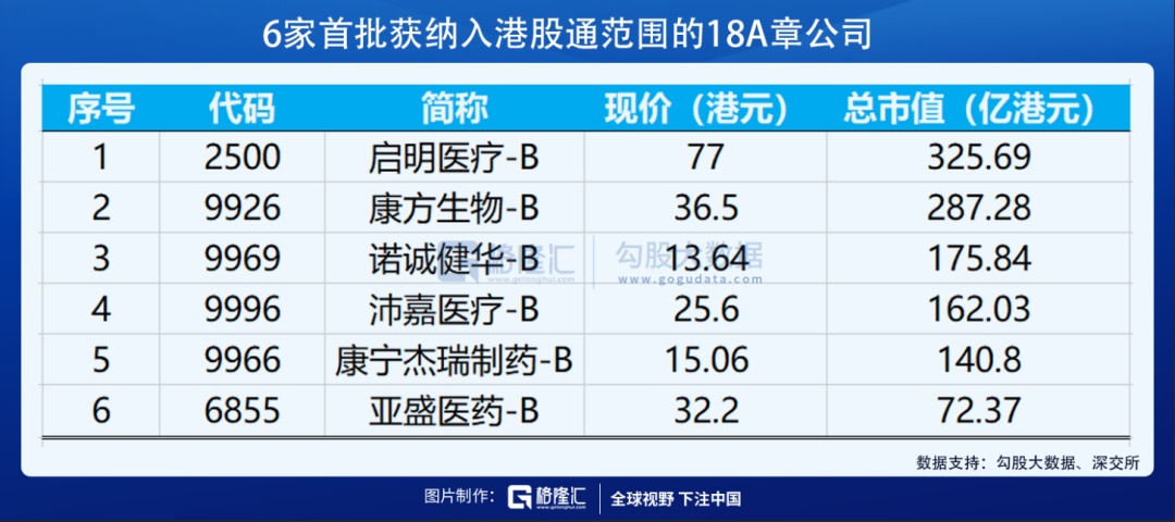 根据新规,18A公司只需要满足“恒生综指成分股且考察截止前12个月平均月末市值不低于50亿港元”或“AH两地上市”即可被纳入港股通股票名单。首批6家入围的企业市值如下: