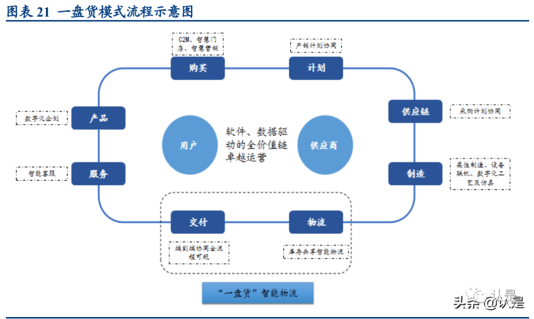 物流环节——全流程数字化物流管理:智能物流改善从供方发货、入场预约、车 位管理、卸货管理、出厂管理等实现全流程透明。通过商业模式的创新,优化库 存布局,帮助客户降低库存、提高货物周转效率。