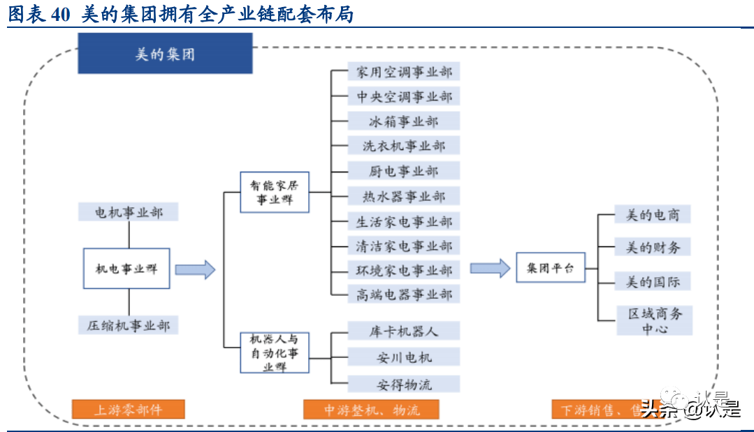 供应链方面:美的布局覆盖上下游,产业链配套齐全。美的早在上世纪 90 年代就 开始通过收并购切入家电核心零部件领域,成立威灵控股、与日本三洋合作生产 电。