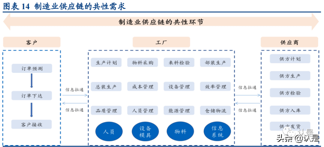 基于互联网企业提出的中台理念,反观制造业,众多细分产业链均具备共性需求—— 不同的家电产品、不同的工业机械产品的价值链流程中均涵盖了工厂及产线搭建、采 购、生产、质量控制、物流等。在大制造供应链中,统一的信息流系统、能力层、应 用层存在共性,共性的信息和底层能力支撑整合在一起,就以“泛中台”的形式表现 出来。