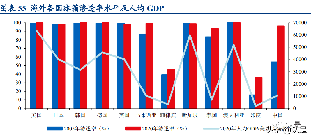 冰箱:成熟区域渗透率已饱和,南亚、东南亚市场仍有上升空间。基于冰箱对于 食材保鲜的必选消费属性,为各国优先普及品类,各发达国家冰箱至 2020 年渗透 率差异都很小均达 95%以上,而人均 GDP 处于极低水平的印度、菲律宾、泰国等 渗透率分为 36%、45%、93%,尚处普及覆盖其,赛道仍有较大扩张空间。