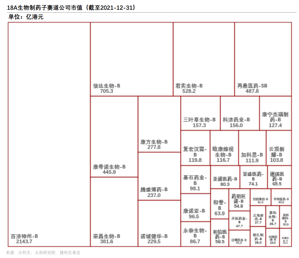 换言之,18A生物制药赛道公司的“二八效应”明显。市值排名第一的百济神州,以2143.7亿港元的市值占据35家生物制药企业总市值7374.3亿港元的29.1%,基本相当于2-5名的市值总和,也接近于市值后27家18A生物制药公司的全部市值总和。