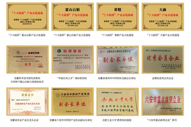 公司立足金寨及皖西大别山区丰富的中药材资源,在燕子河镇塔儿河工业区新建地产中药材无硫加工厂4200平米,中药材冷库1060立方米,开展石斛、天麻、茯苓、黄精等地产中药材贮藏保鲜与加工;依托近邻天堂寨5A景区及燕子河大峡谷4A景区区位优势及优越的生态环境优势,在燕子河镇大峡谷等村新建100亩石斛生态园及20亩皖西珍稀名贵中药材百草园,其中,霍山石斛大棚栽培50亩,林下栽培石斛50亩,活树附生栽培林木800余株,建成高品位的霍山石斛休闲、观光、养生基地及皖西珍稀名贵中药材品种园与鉴赏基地;依托和安农大、浙江农林大产学研合作,研发山区经济林与地产木本中药材和草本中药材三层复合经营的先进种植模式及林下复合经营种植技术,鉴定了“天然林下霍山石斛立体栽培技术研究”、“大别山山核桃林下中药材复合经营技术研究”2项省级科技成果并获市科技进步奖;应用先进成果技术,新建林下结香、黄精、重楼(七叶一枝花)、白芨复合经营地产中药材基地510亩,建成土地集约、生态环保、复合叠加效益显著的林下中药材产业基地。公司先后获得中公金寨县“优秀会员企业”、六安市中药材产业协会“副会长单位”、2020年“安徽“十大皖药”产业示范基地”等荣誉称号。