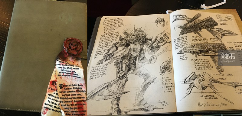在《卡桑德拉生物志》的背后,还藏着一个更大的设定。板砖有一个厚厚的本子,里面藏了他整理的构想——一个“秦汉朋克”风格的世界。在板砖心目中,“秦汉”是中国文明起飞的时代,充满了剽悍进取的气质,最符合他想要勾画的场景:人类在蛮荒之地的生存与战斗。“联邦限制了开拓者的机甲规格,于是这些中国人的后裔就自己想办法,比如加装甲片,最后做成了像是古代盔甲的模样。”
