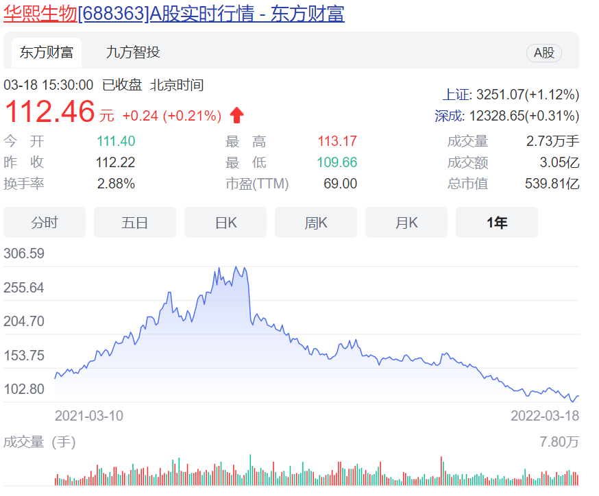 据3月18日收盘收据,华熙生物股价收于112.46元/股,不仅是年内新低,相比去年的股价峰值,市值也缩水了近60%。市值缩水的背后,很显然也是投资者对华熙生物的信心更在丢失。